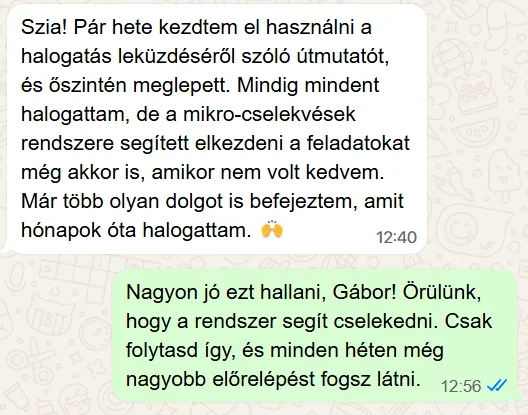 Azonnali hozzáférést kapsz egy lépésről lépésre felépített útmutatóhoz, ami pontosan megmutatja, mit tegyél, amikor halogatnál — felesleges elmélet nélkül.